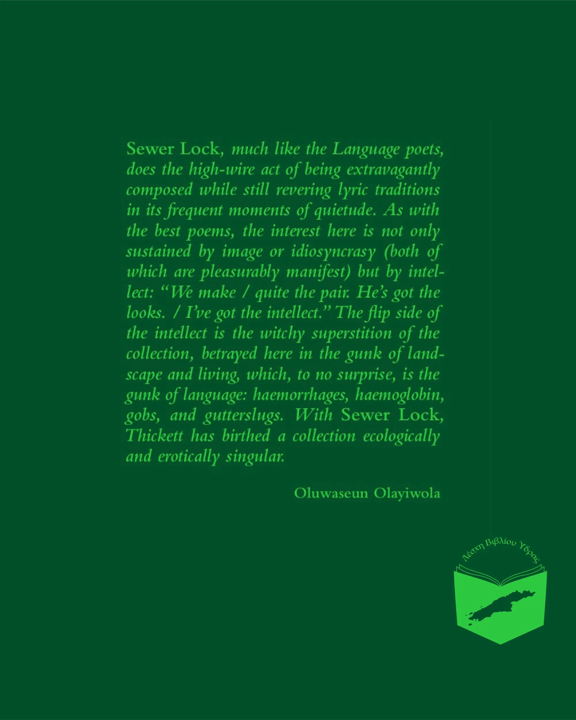 “Sewer Lock, much like the Language poets, does the high-wire act of being extravagantly composed while still revering lyric traditions in its frequent moments of quietude. As with the best poems, the interest here is not only sustained by image or idiosyncrasy (both of which are pleasurably manifest) but by intellect: “We make / quite the pair. He’s got the looks. / I’ve got the intellect.” The flip side of the intellect is the witchy superstition of the collection, betrayed here in the gunk of landscape and living, which, to no surprise, is the gunk of language: haemorrhages, haemoglobin, gobs, and gutterslugs. With Sewer Lock, Thickett has birthed a collection ecologically and erotically singular.”